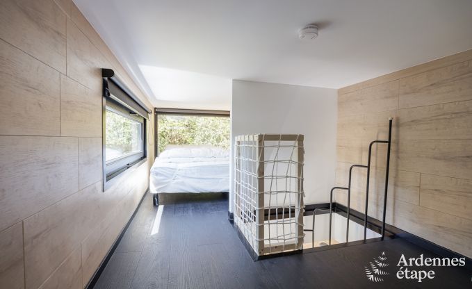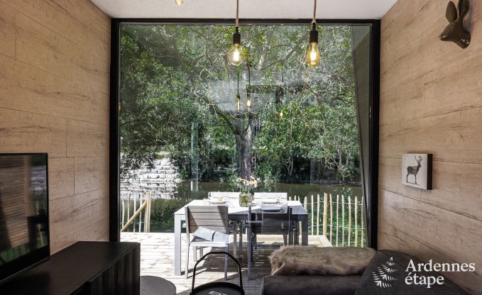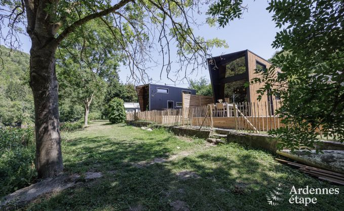 Small but nice. Incredibly nice, even! Because despite its small dimensions, you can still enjoy air conditioning, a fully equipped kitchen with everything you need, a cozy seating area with TV, and a huge window that directly overlooks the river, which is only 10 meters away. You also have a complete bathroom with shower, sink, and toilet. You will sleep on the upper floor in 2 mezzanine rooms. At first glance, they may seem to have a low ceiling, but you will get used to it immediately. One room has a double bed, the other has 2 single beds. Ideal for a family! Outside, you have a garden and a wooden terrace where you can eat and have a barbecue. Good to know: your dog is also welcome here!