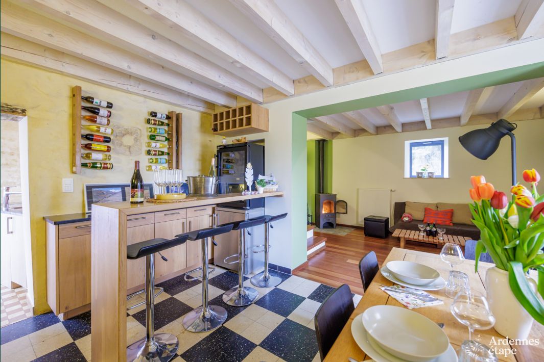This delightful holiday home from 1790 near the La Chière River (and French border) is brimming with authenticity and charm. After an activity-filled day, get comfortable in a chair by the fire or toast to good memories at the bar in the dining area. Our tip? The local markets sell fantastic regional products. And Orval, famous for its delicious beer and cheese, is not far away! There is also plenty to enjoy outdoors: the sunny terrace with ochre-coloured walls will make you feel as if you’re in the French Provence.